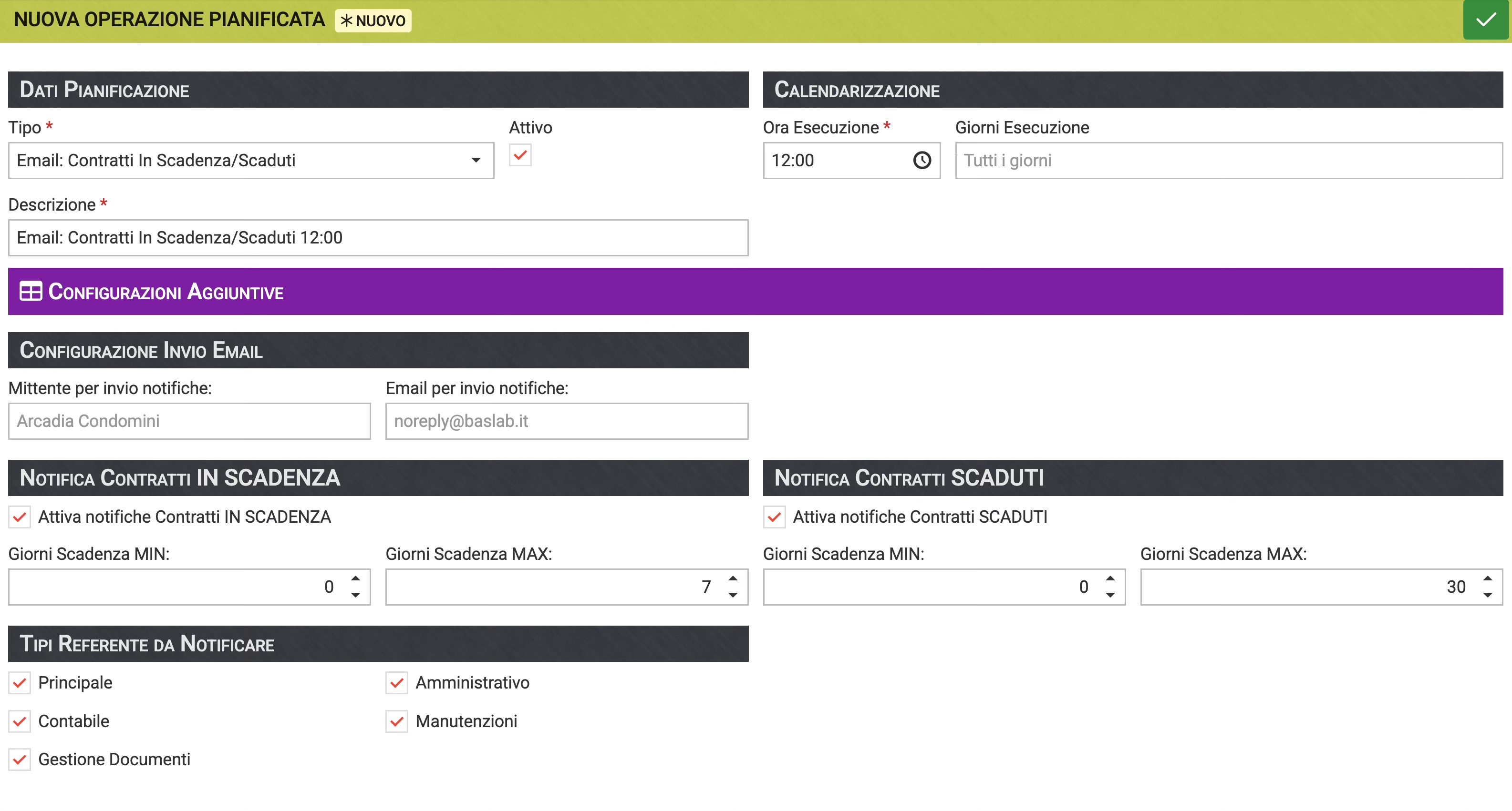 Si potranno configurare quanti giorni prima della scadenza o quanti giorni dopo la scadenza di un Contratto si riceverà l’avviso, a condizione che sia stata impostata la data di scadenza del documento-contratto, quando ne è stato importato il file.