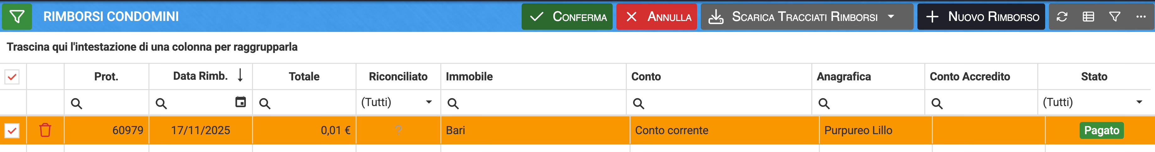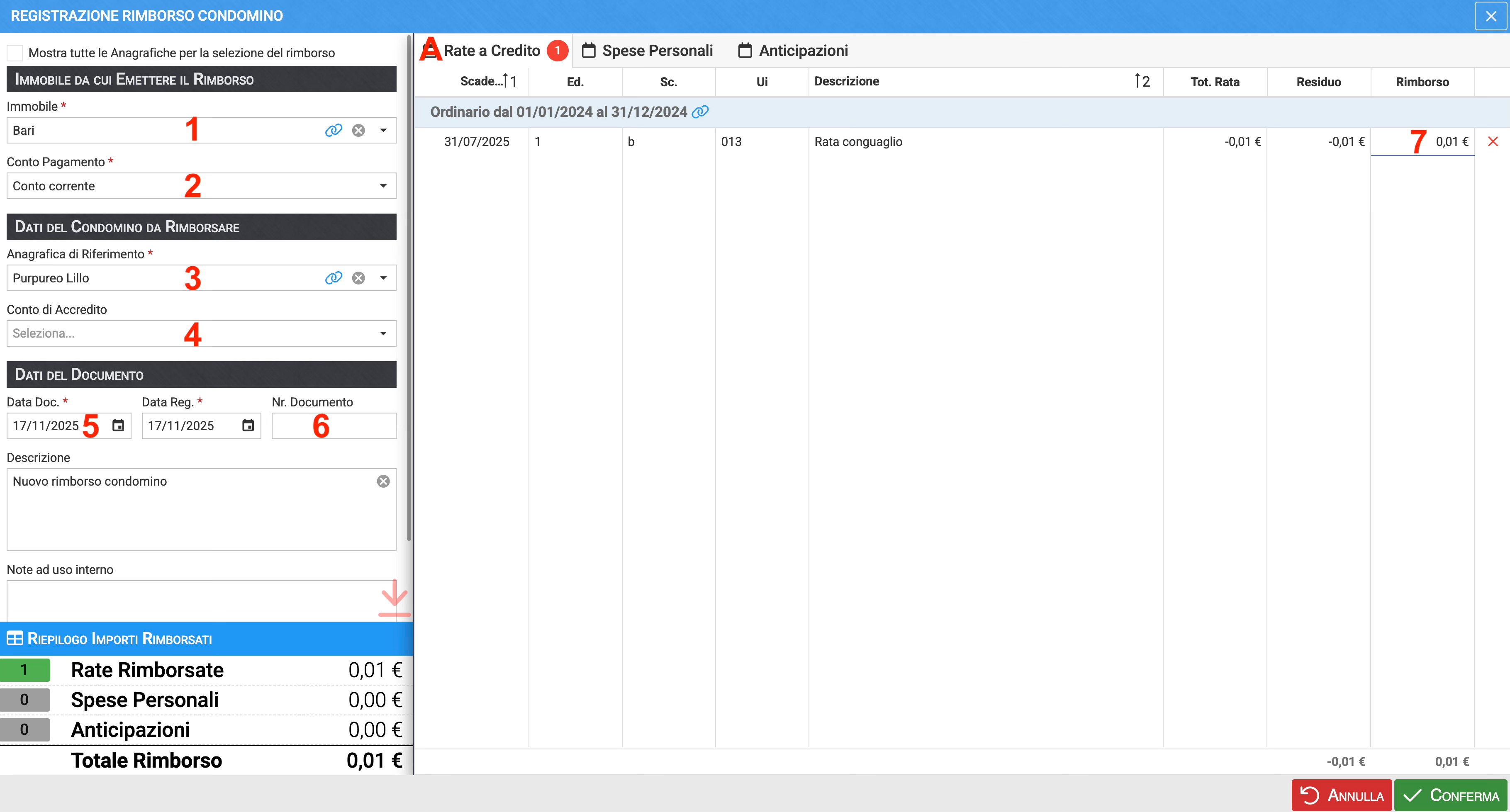 Nel caso in cui si voglia annullare una rata a credito giustificandola con un bonifico al condomino, si clicchi sul tasto + Nuovo rimborso e compilare, dopo aver selezionato la sezione Rate a Credito (A):