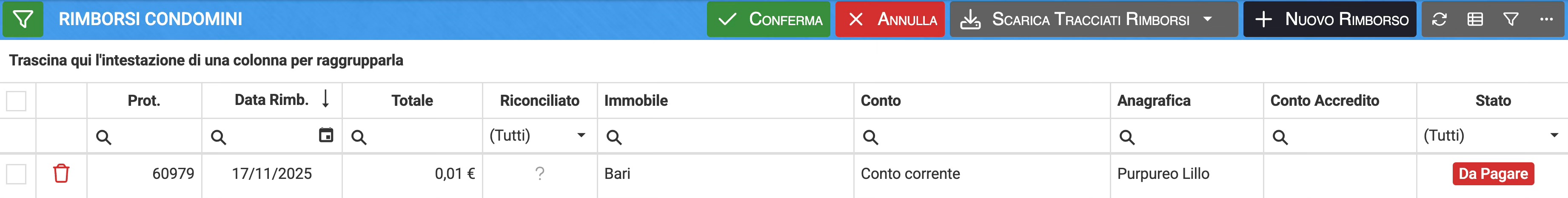 Quando si procederà ad effettuare il pagamento, se ne potrà dare Conferma utilizzando l‘apposito tasto. Si può creare un tracciato per effettuare l’operazione cliccando sul tasto Scarica Tracciati Rimborsi .