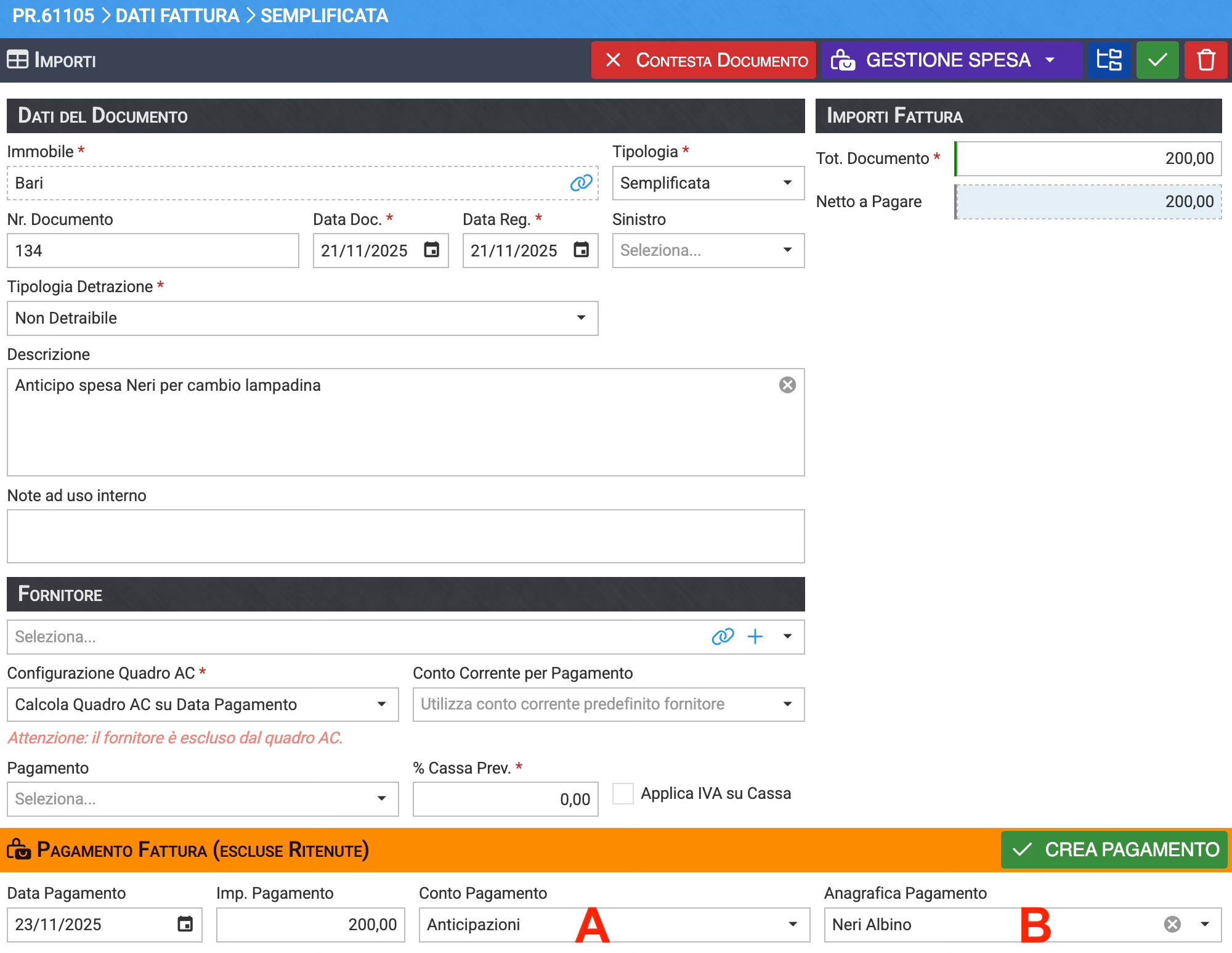 Nel caso in cui un condomino abbia anticipato delle spese per conto del condominio. Per procedere alla restituzione di quanto anticipato, si dovrà registrare la fattura (anche come Semplificata) e pagarla da un Fondo (A) creato con la tipologia Anticipi. Scegliendo una tale modalità verrà reso disponibile un campo che su cui si potrà riportare l’Anagrafica del condomino (B).