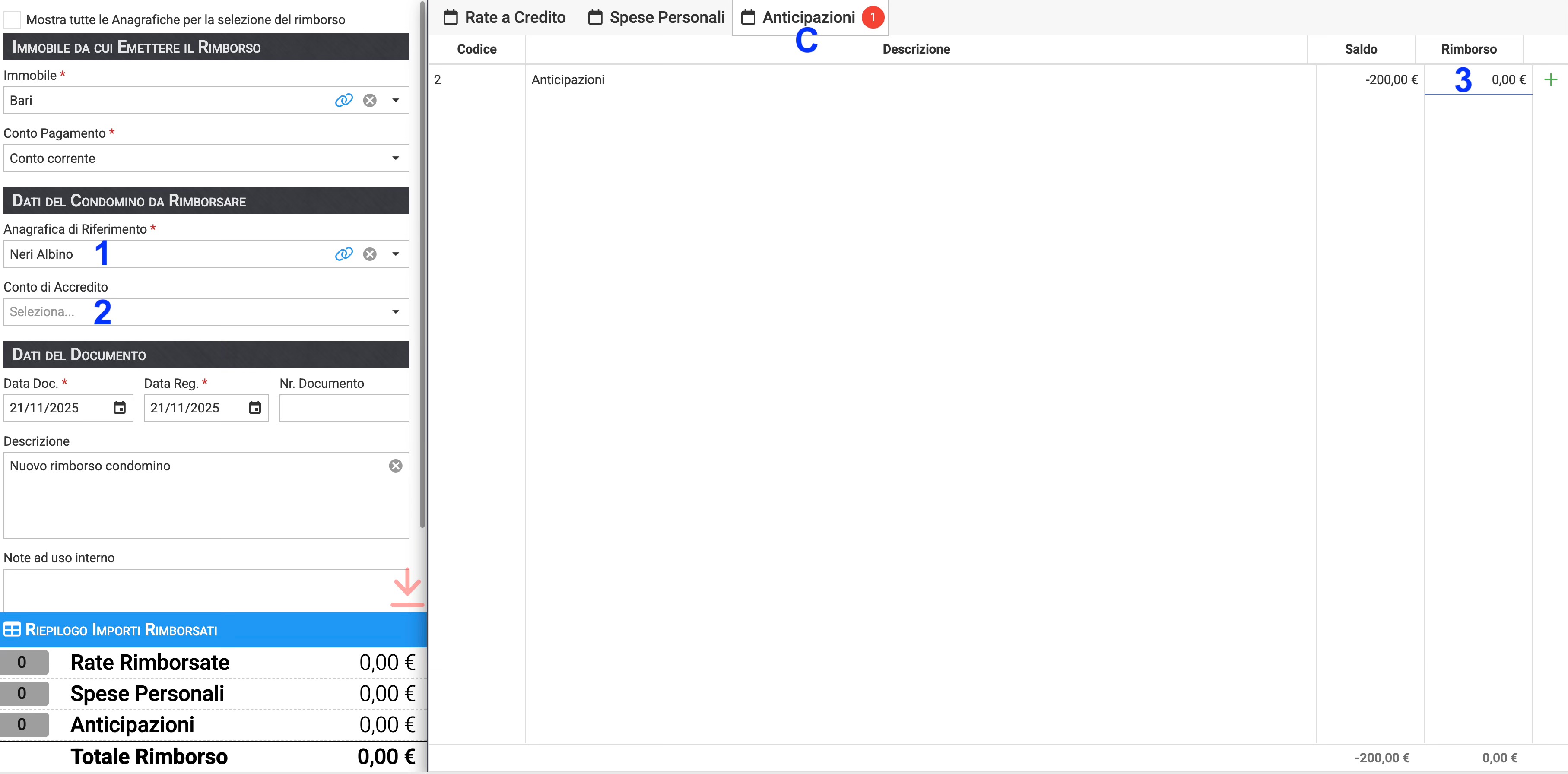 Nella sezione Anticipazioni (C) verrà riportata una riga che indica l’importo anticipato, scrivendo il valore che si vuole rimborsare al condomino (3) e dando Conferma, si procederà alla registrazione.