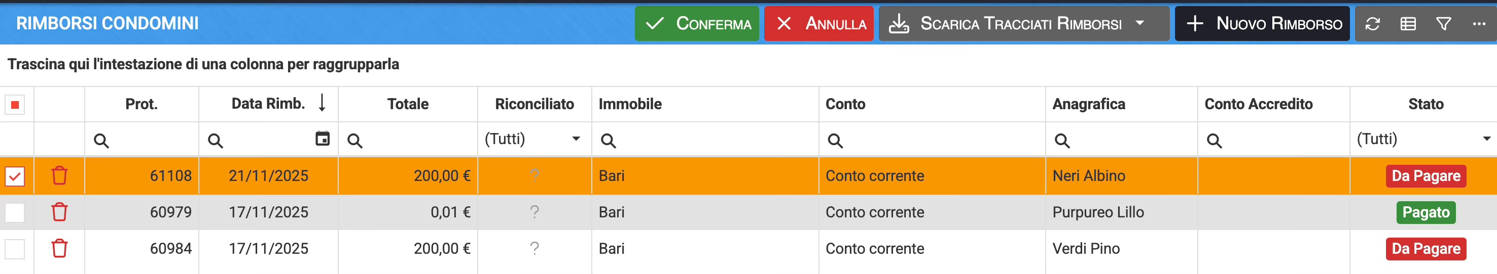 Si ricorda di terminare la procedura selezionando la riga che riporta la registrazione di rimborso, cliccando sul tasto Conferma.