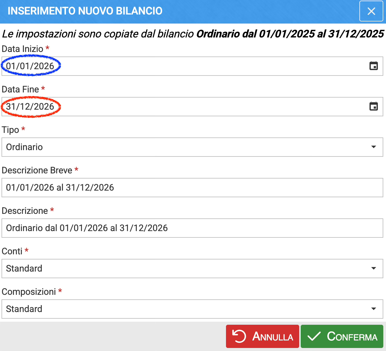 Dopo aver cliccato, verrà mostrata una maschera che riporta le stesse impostazioni presenti nel Bilancio “vecchio”, riportando le stesse date di inizio e fine ma con un anno in aggiunta.